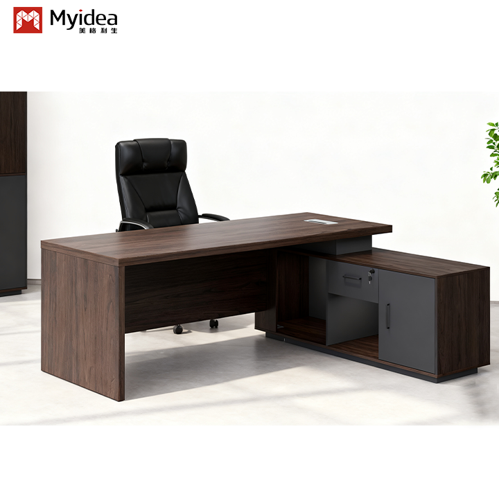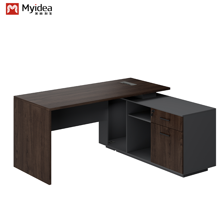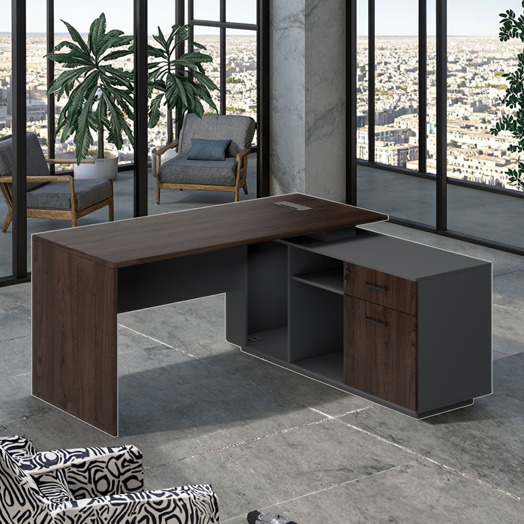 میز کامپیوتر مدیریتی با کمد ذخیرهسازی، طراحی مدرن پنل چوبی، ساختار بادوام و سازگار با محیط زیست، نیاز به مونتاژ دارد